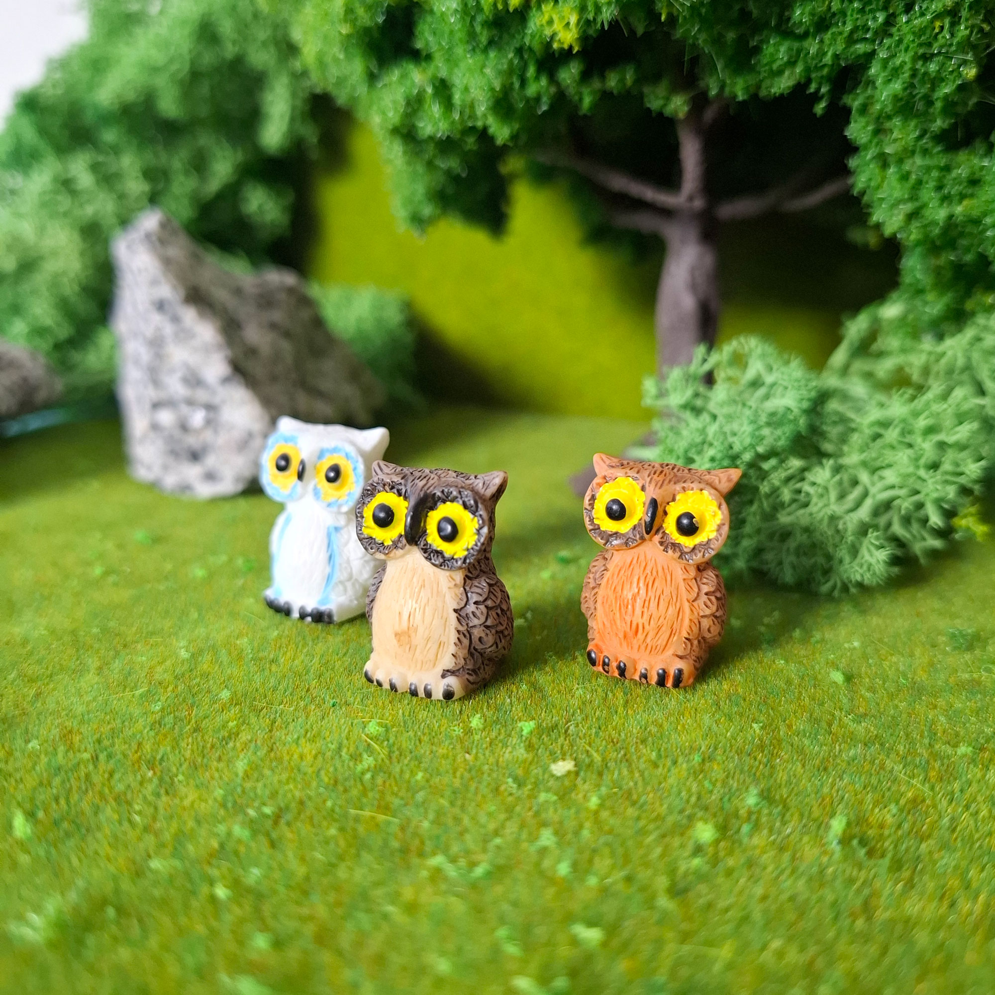 Búho en miniatura que puede ser utilizado en la elaboración de maquetas, manualidades, micropaisajes, jardines, dioramas e infinidad de ideas.